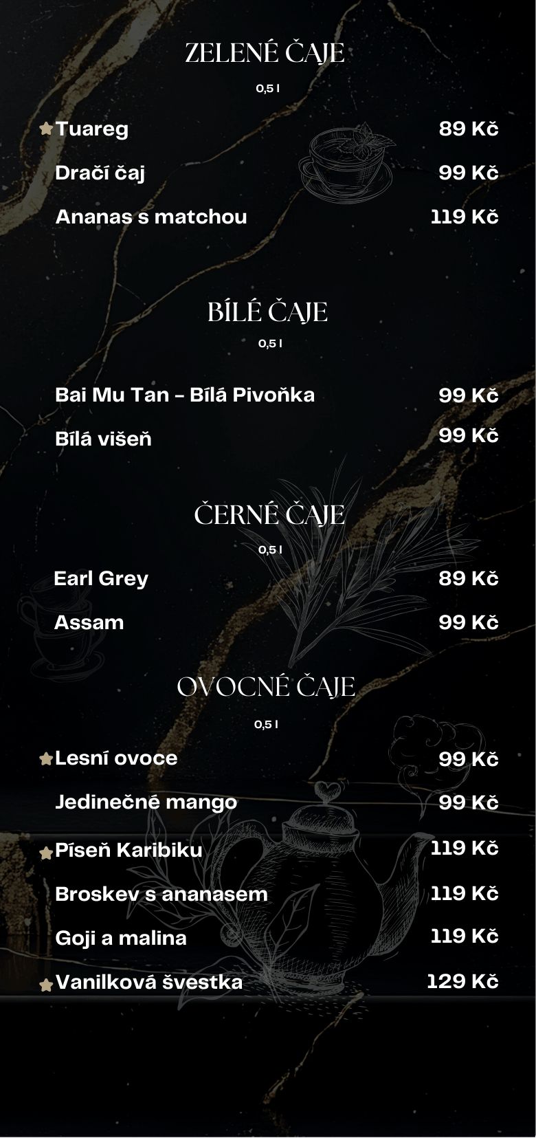 Od čajů, přes domácí limonády, drinky, až po vodní dýmky.
